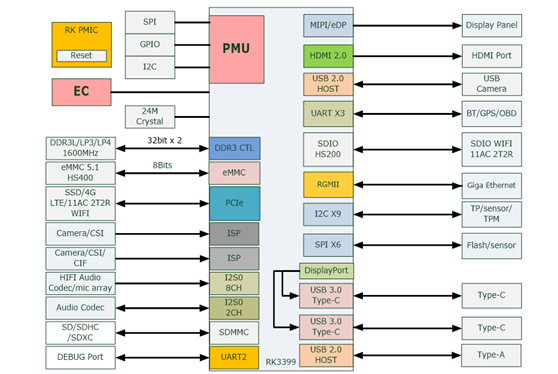 从RK3399硬件系统框架图来看,开放接口极为丰富: